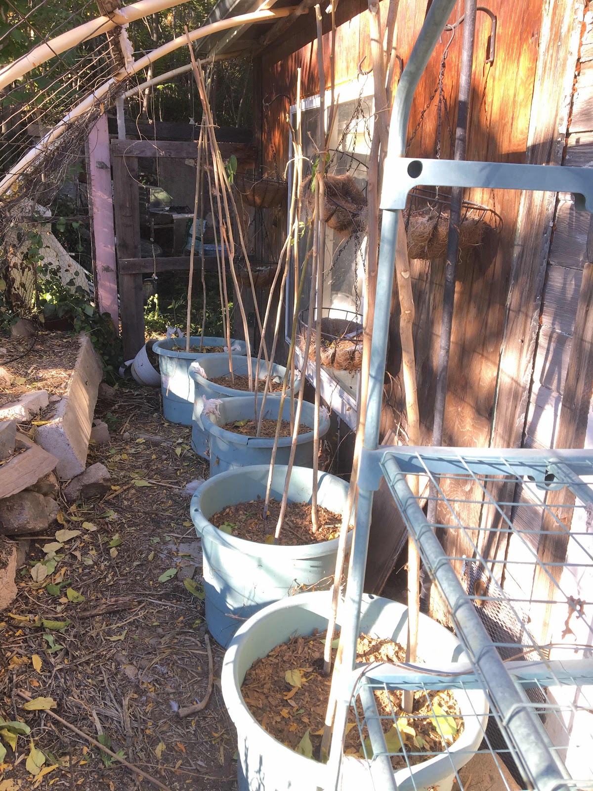 I got these tubs on clearance for about $5 each a long time ago. Just drilled some drain holes in them. I topped them up with fresh compost and added some poles. Two tubs were planted with sweet pea flowers and the other three with Dwarf Grey Sugar peas.