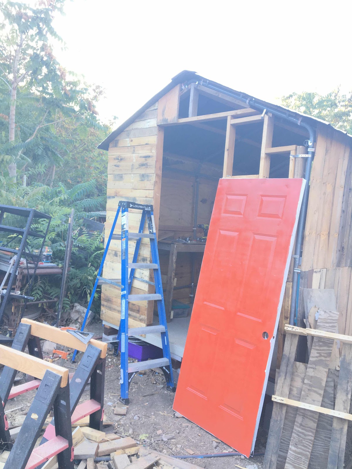 Almost there on this section but all the batteries were dead. I *could* have drug out the electric tools but I was too tired to bother. Instead I rounded up some crates and corralled the small scrap for kindling. I’m trying to get this side of the wall done and painted so I can hang the door and start on the other side.