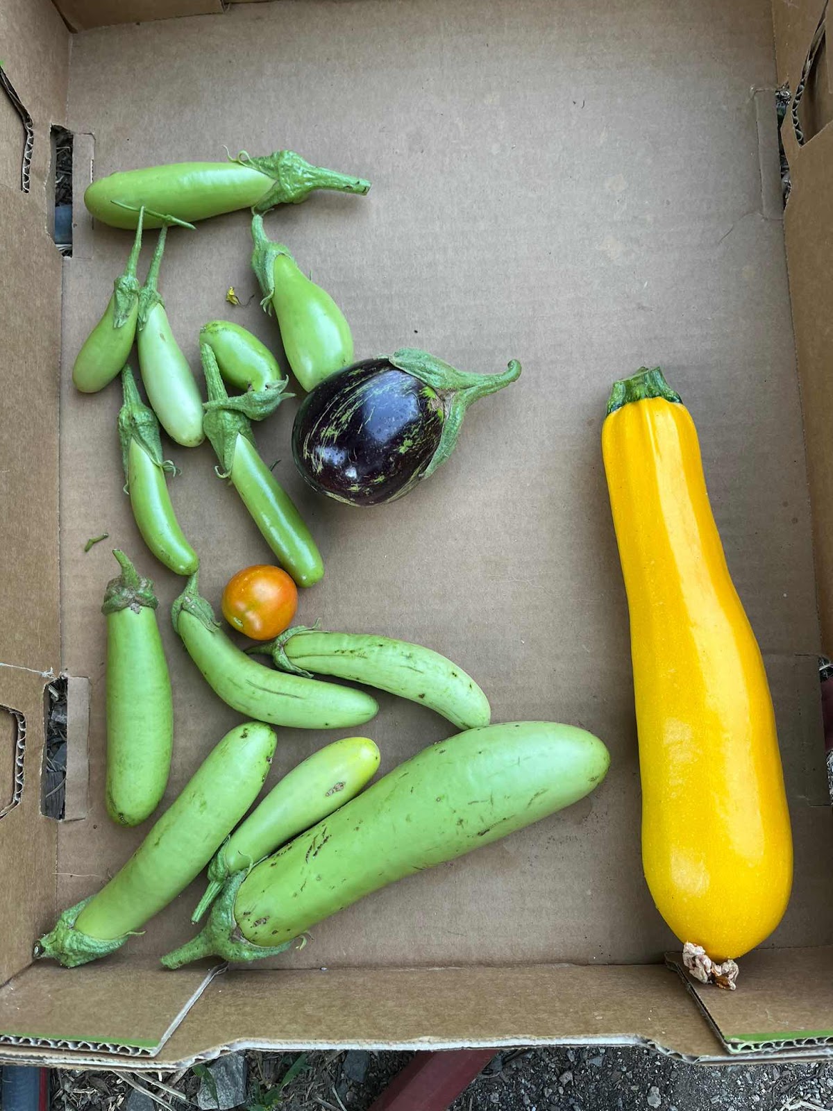 | Eggplant, yellow zucchini and a lone tomato |